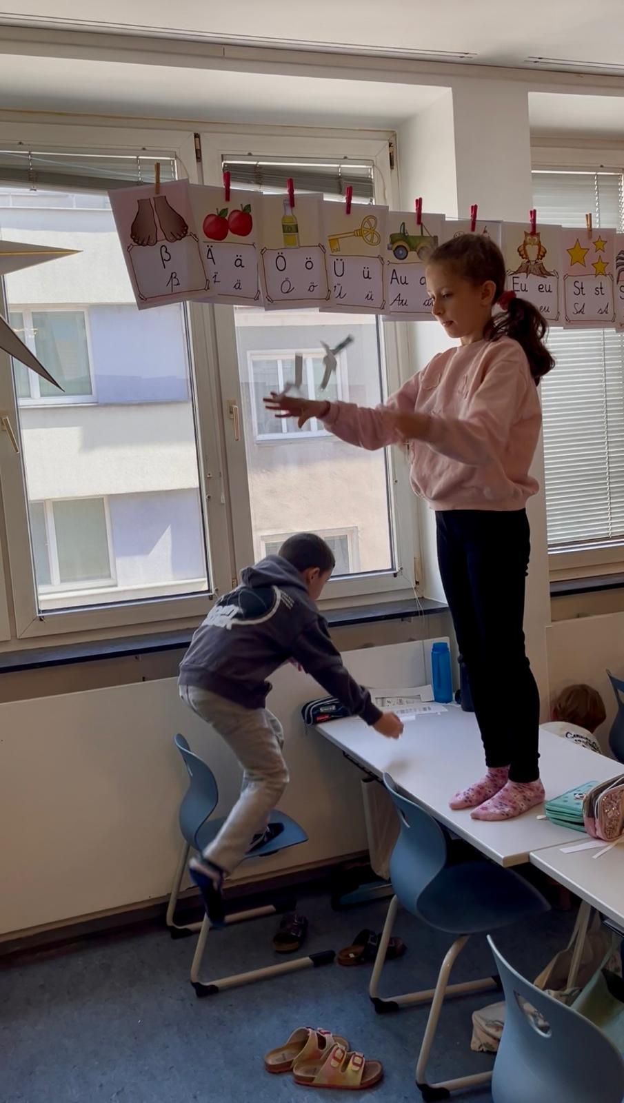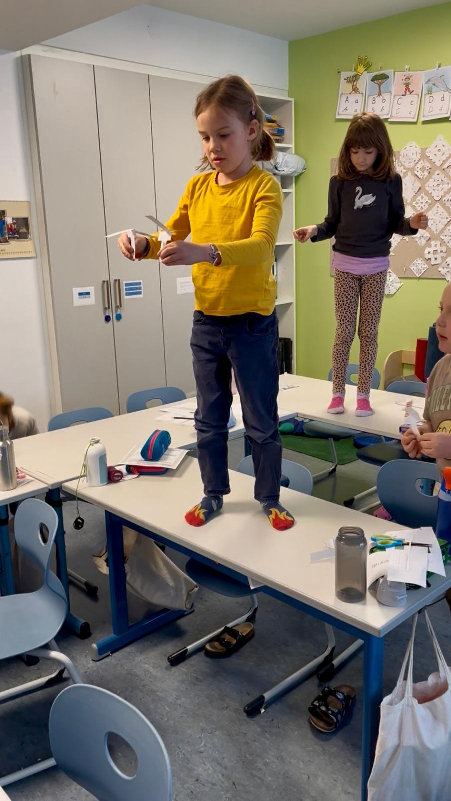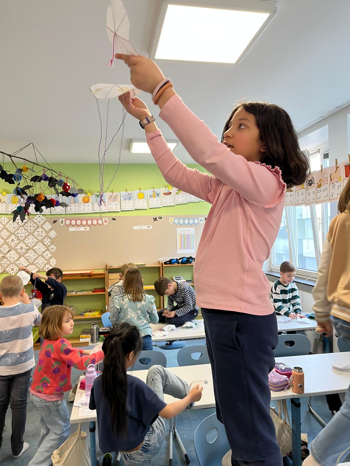 Besonders spannend ist das praktische Arbeiten: Wir bauen einfache Flugobjekte wie Papierhelikopter, Fallschirme und Papierflieger und erproben sie gemeinsam. Dabei vergleichen wir unsere Ergebnisse und überlegen, warum manche Modelle besser fliegen als andere.