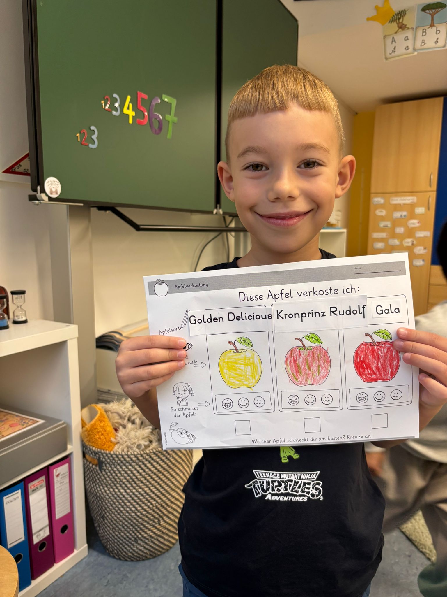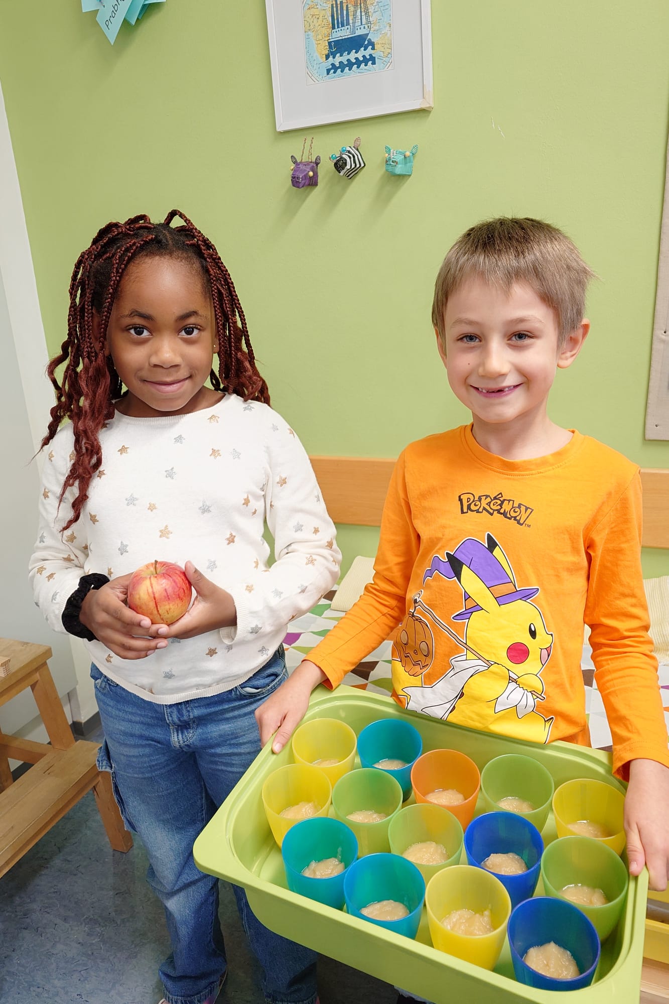 Im September drehte sich bei uns alles um den Apfel: Wir lernten die verschiedenen Teile des Apfels kennen und entdeckten, wie sich der Apfelbaum im Jahreskreis verändert. Besonders spannend war unsere Apfelverkostung – wir probierten viele verschiedene Sorten und stellten fest, wie unterschiedlich Äpfel schmecken können. Ein weiteres Highlight war das gemeinsame Apfelmus-Kochen – vor allem, als wir es danach verkosten durften.