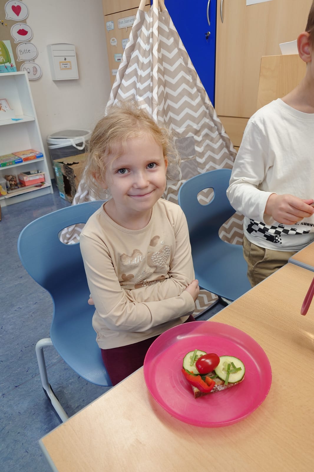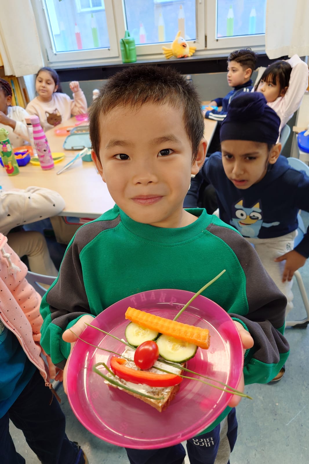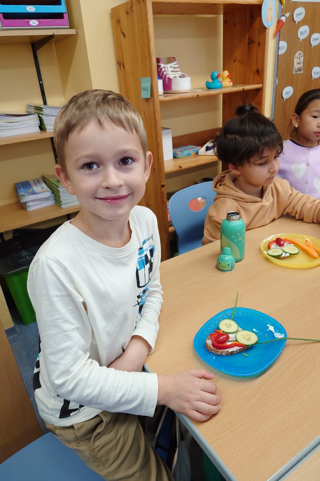 Aus einer Scheibe Vollkornbrot, Aufstrich, geschnittenem Gemüse und Schnittlauch entstanden richtige Kunstwerke zum Essen. Unglaublich,wie kreativ die Kinder waren!