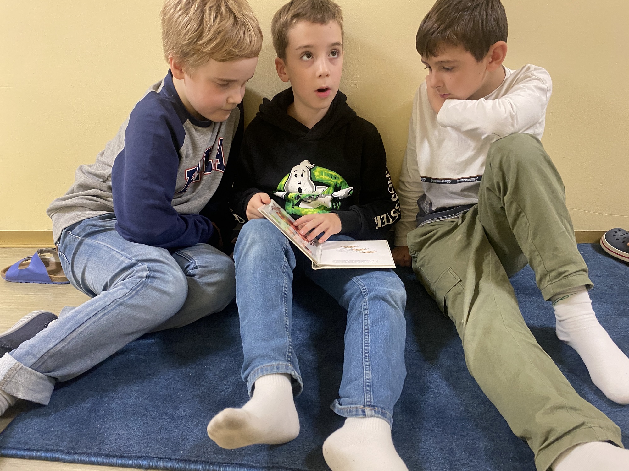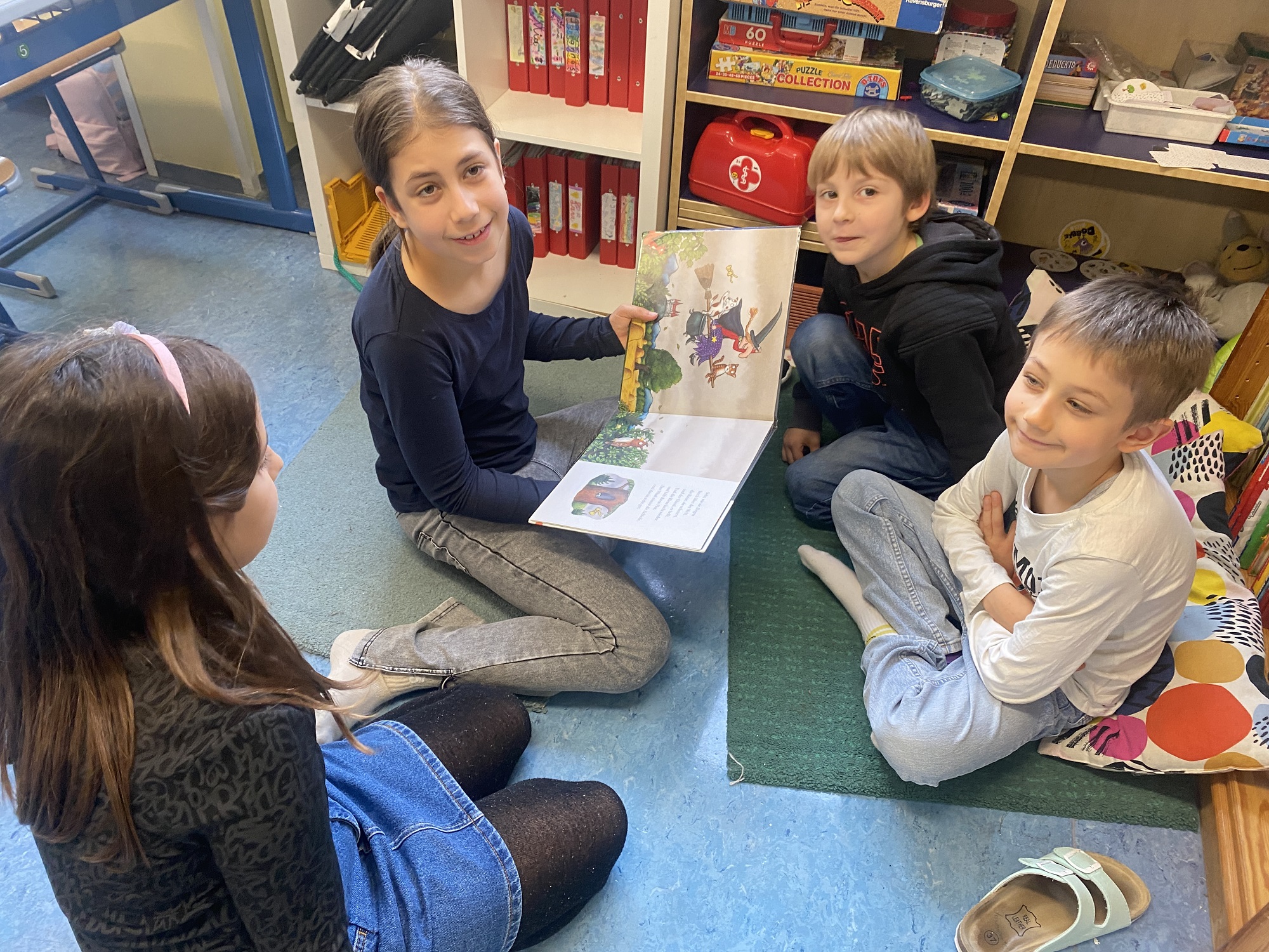 Die Erstklässlerinnen und Erstklässler brachten eines ihrer Lieblingsbücher mit und durften sich ein Kind aus der 4. Klasse aussuchen, das ihnen daraus vorlas. Mit großer Begeisterung lauschten die Kleinen den spannenden, lustigen und abenteuerlichen Geschichten.