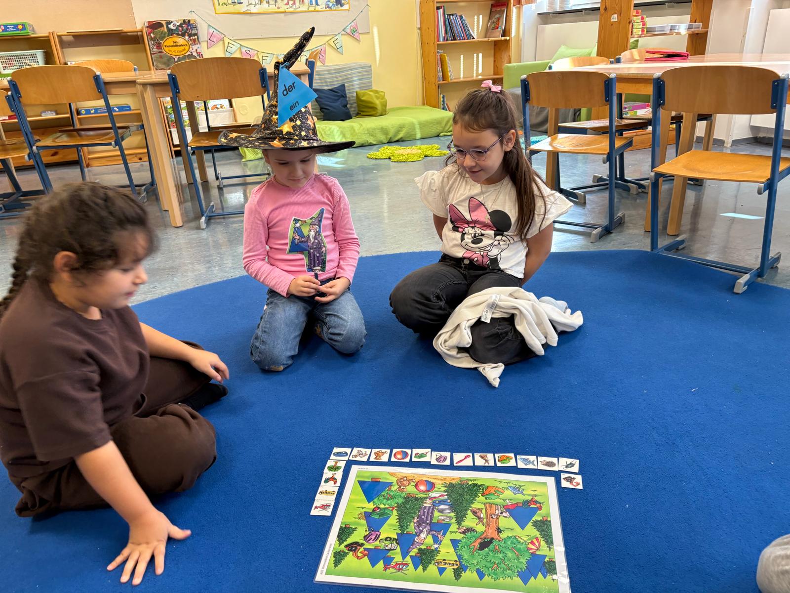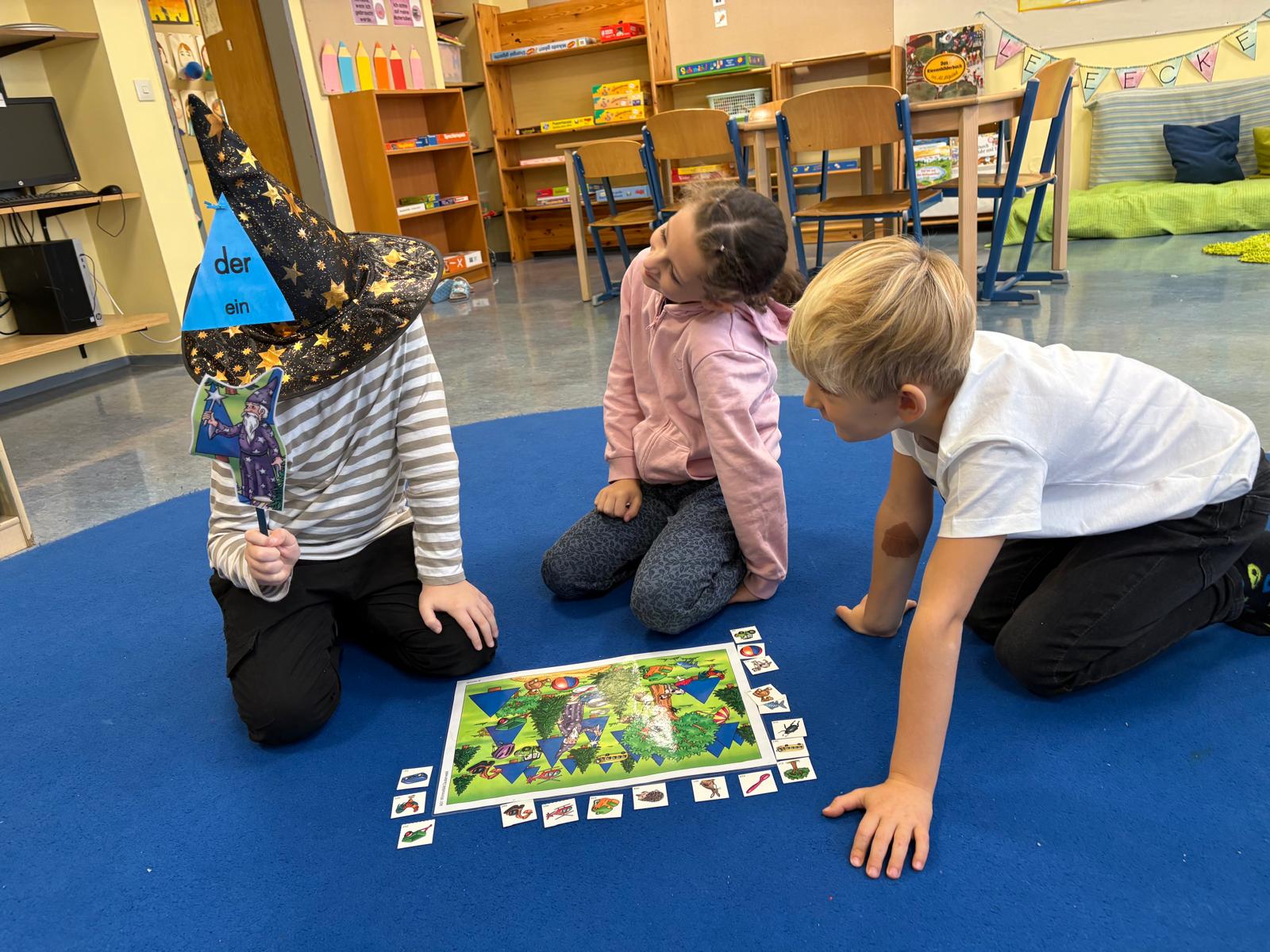 Auch grammatikalische Themen vertieften wir durch Rollenspiele fantasievoll. Um die männlichen Artikel zu üben, durften sich die Kinder beispielsweise in den Zauberer Rubin verwandeln, der nur männliche Nomen in seinen Zauberwald lässt.