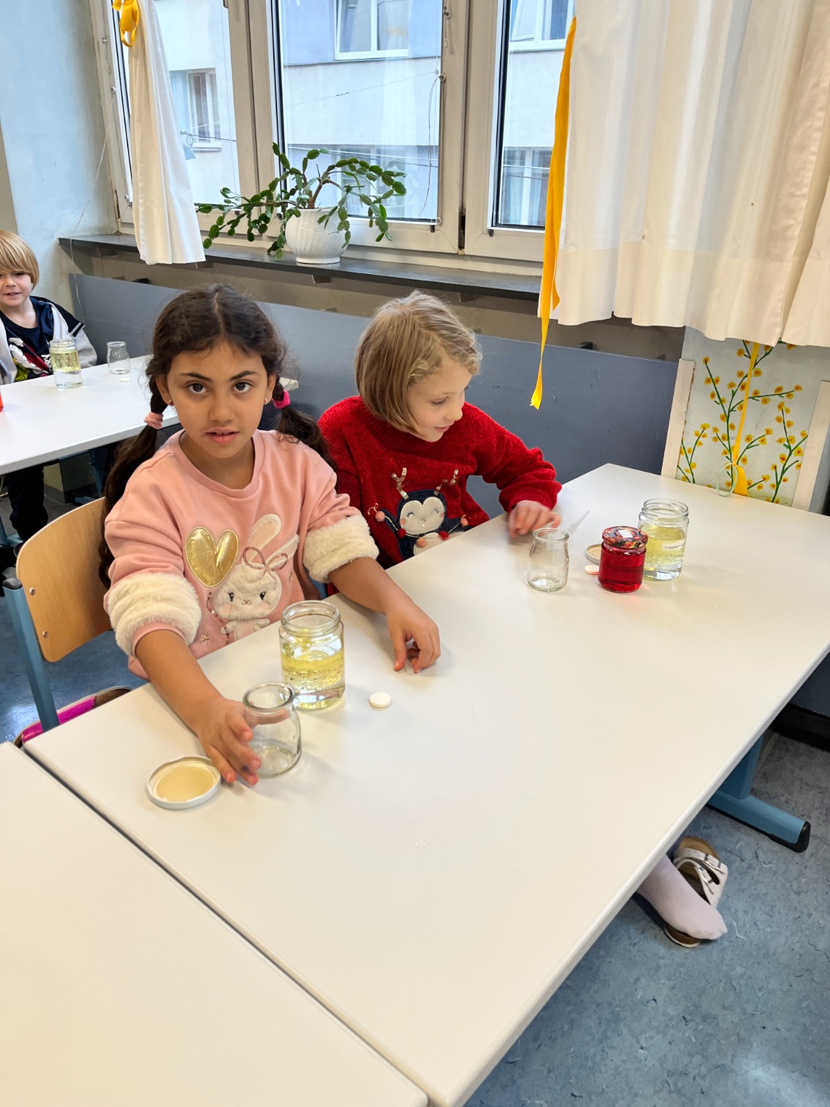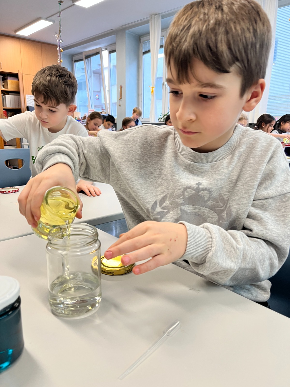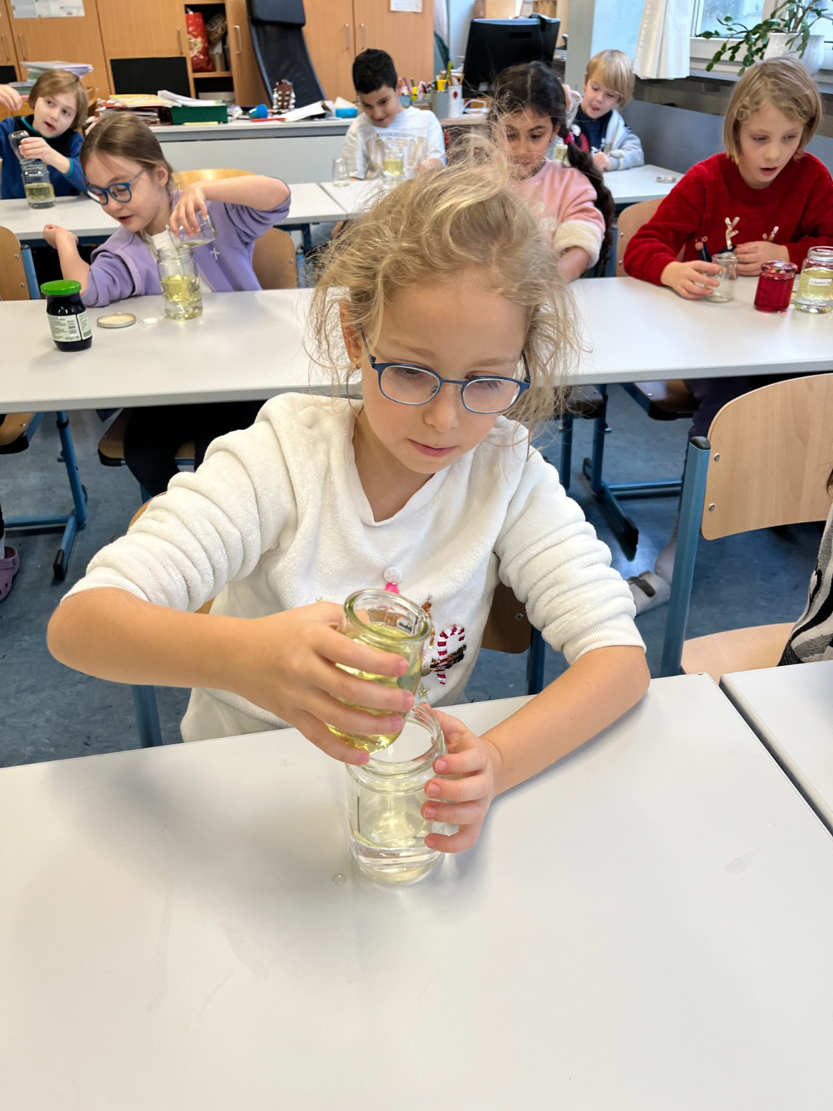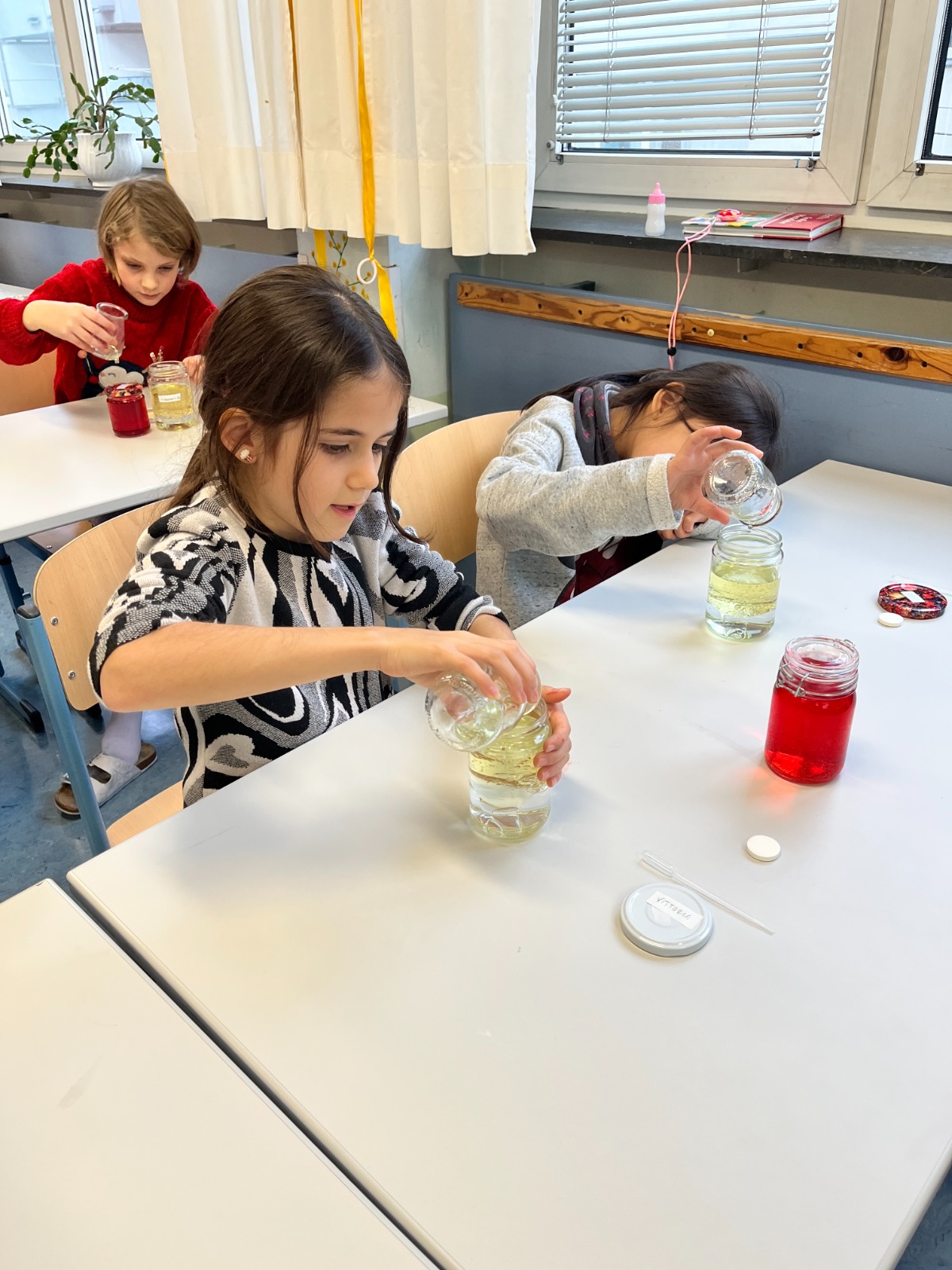 Am Versuchetag hatten die Kinder viel Freude daran, eine eigene Lavalampe herzustellen. Zuerst wurden die Materialien angeschaut und gemeinsam besprochen, wie der Versuch ablaufen wird. Die Schülerinnen und Schüler überlegten, was wohl passieren könnte, und teilten ihre Ideen miteinander.