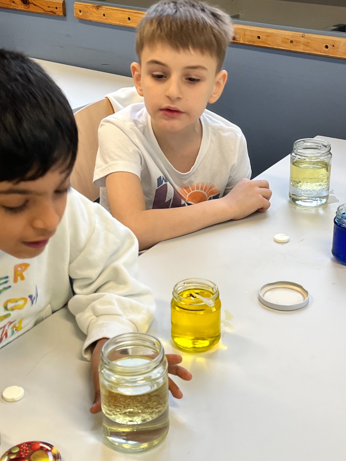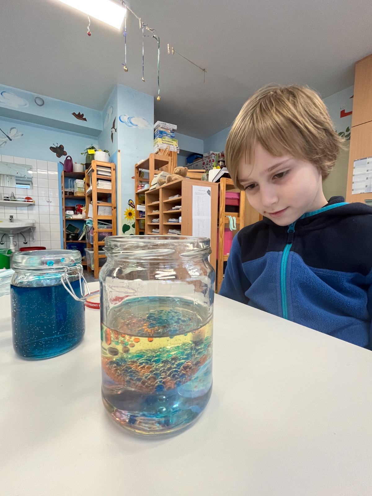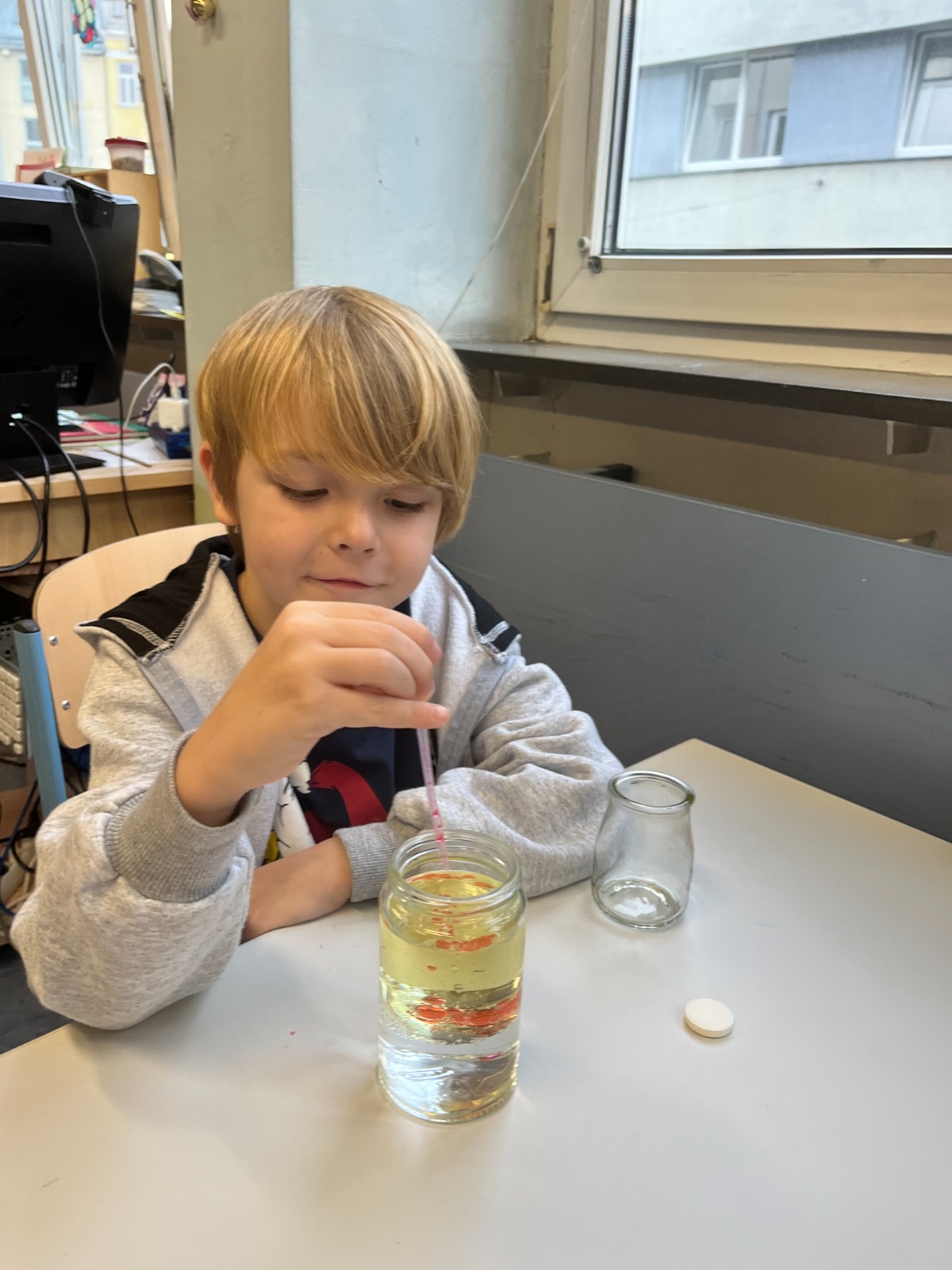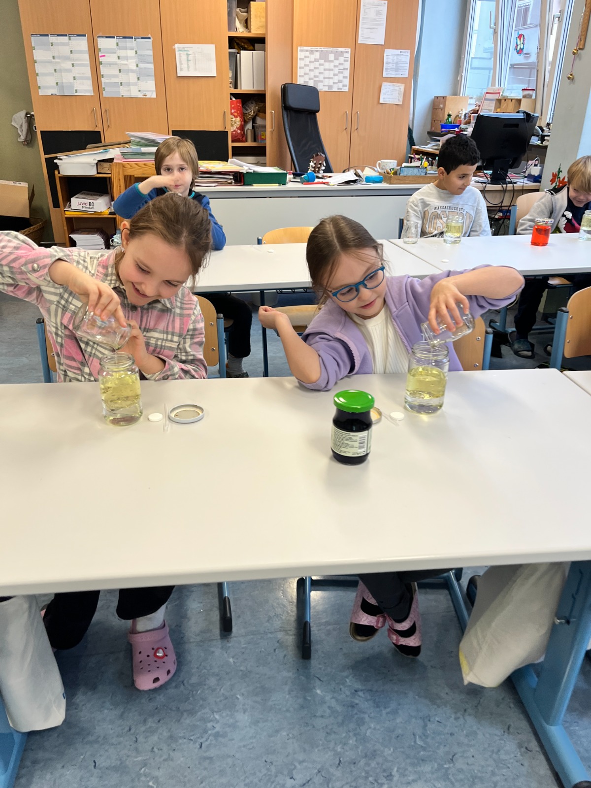 Am Versuchetag hatten die Kinder viel Freude daran, eine eigene Lavalampe herzustellen. Zuerst wurden die Materialien angeschaut und gemeinsam besprochen, wie der Versuch ablaufen wird. Die Schülerinnen und Schüler überlegten, was wohl passieren könnte, und teilten ihre Ideen miteinander.