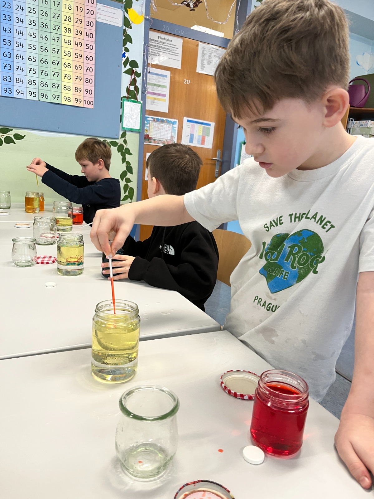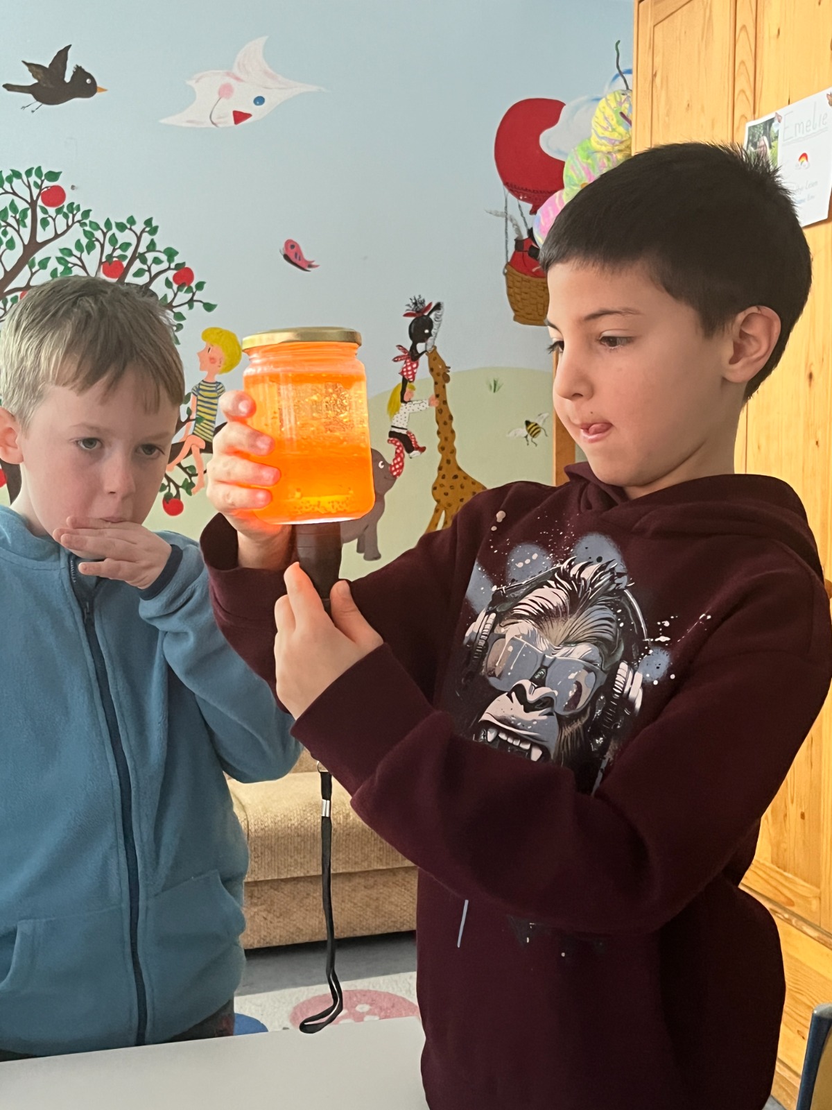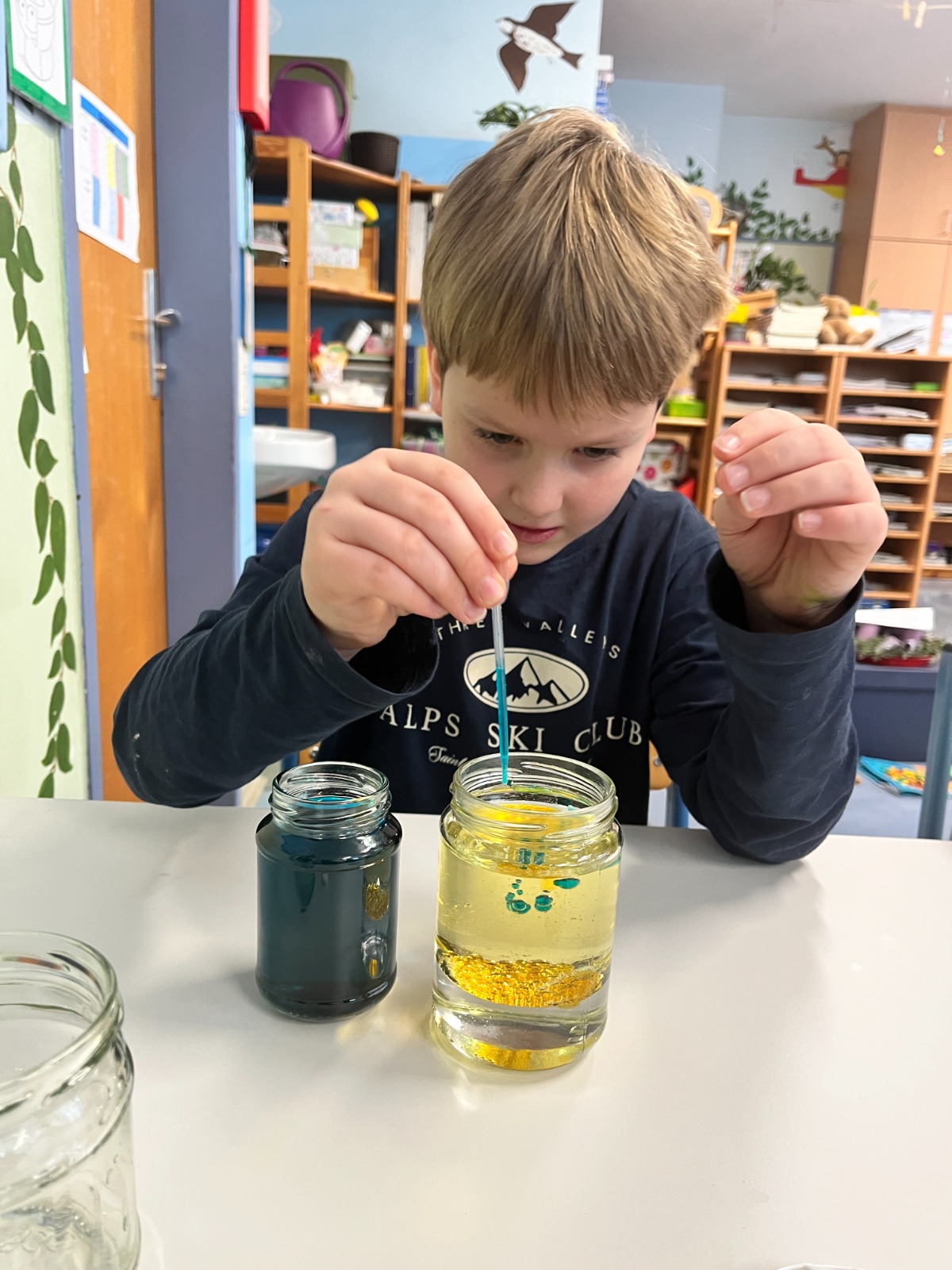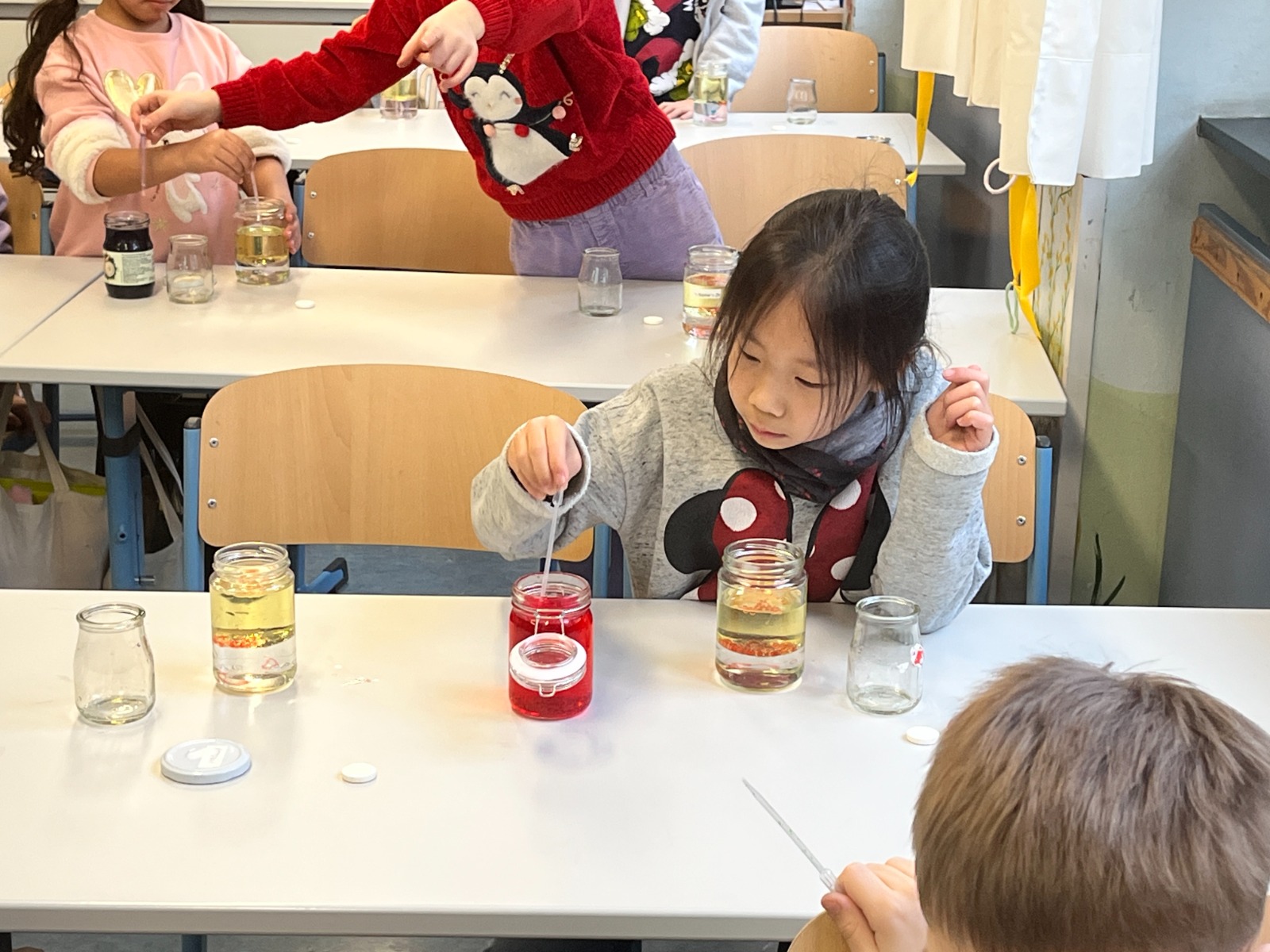 Am Versuchetag hatten die Kinder viel Freude daran, eine eigene Lavalampe herzustellen. Zuerst wurden die Materialien angeschaut und gemeinsam besprochen, wie der Versuch ablaufen wird. Die Schülerinnen und Schüler überlegten, was wohl passieren könnte, und teilten ihre Ideen miteinander.