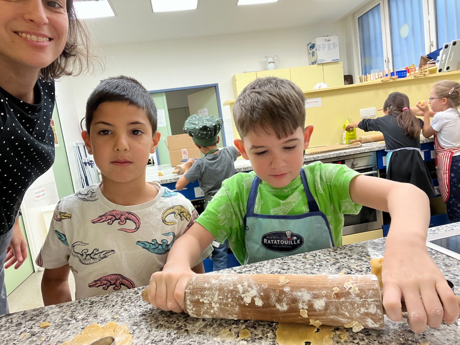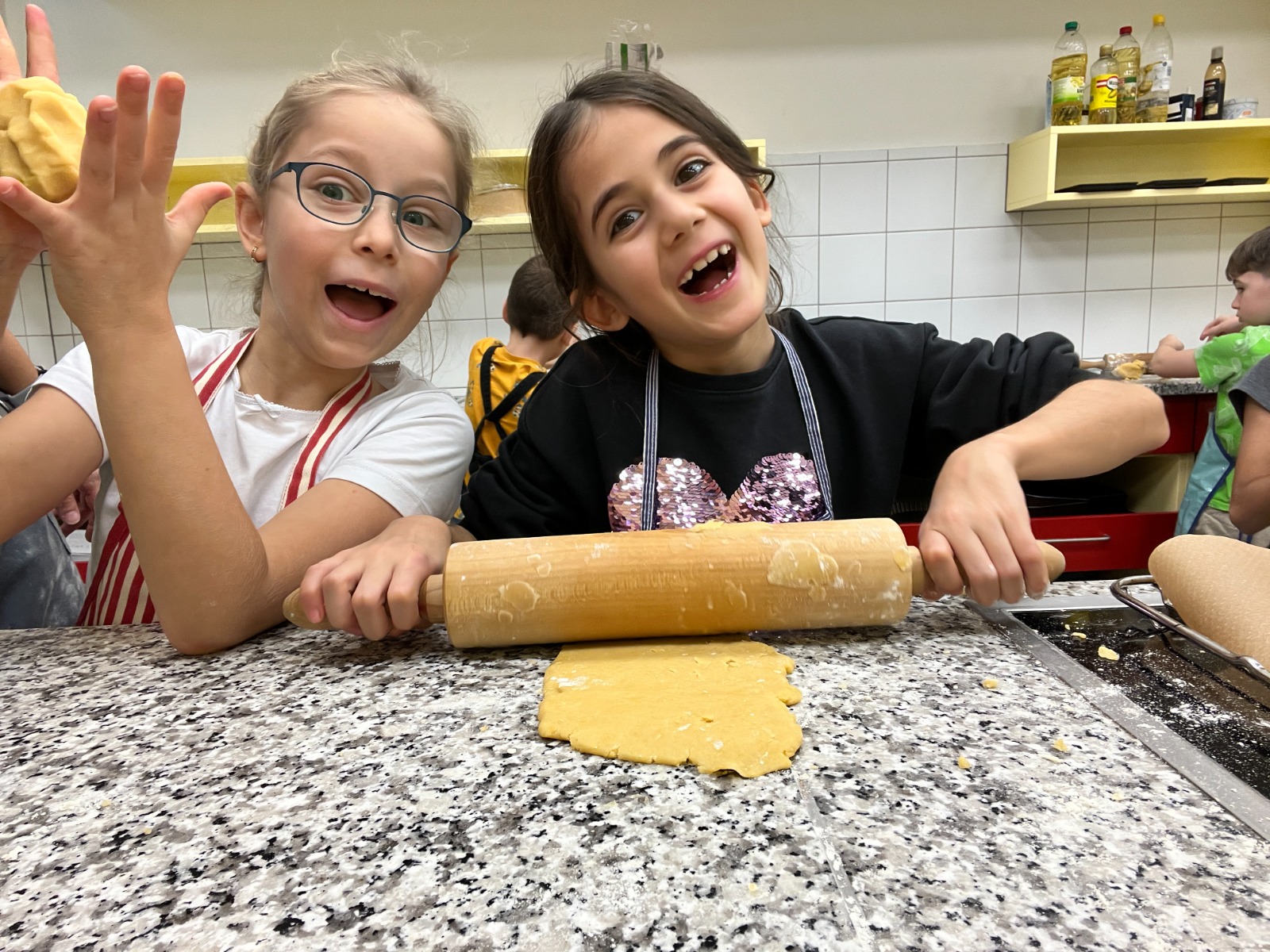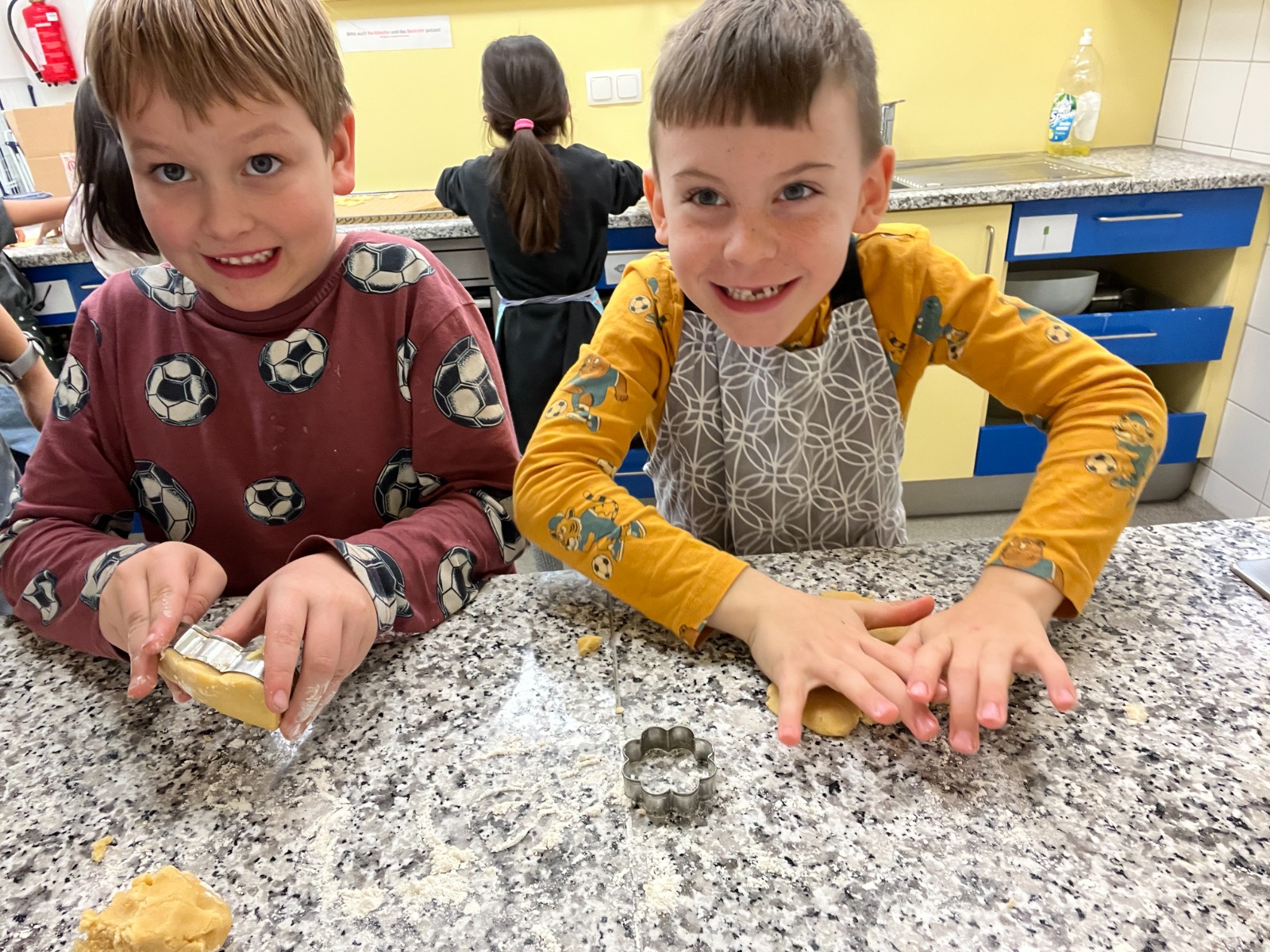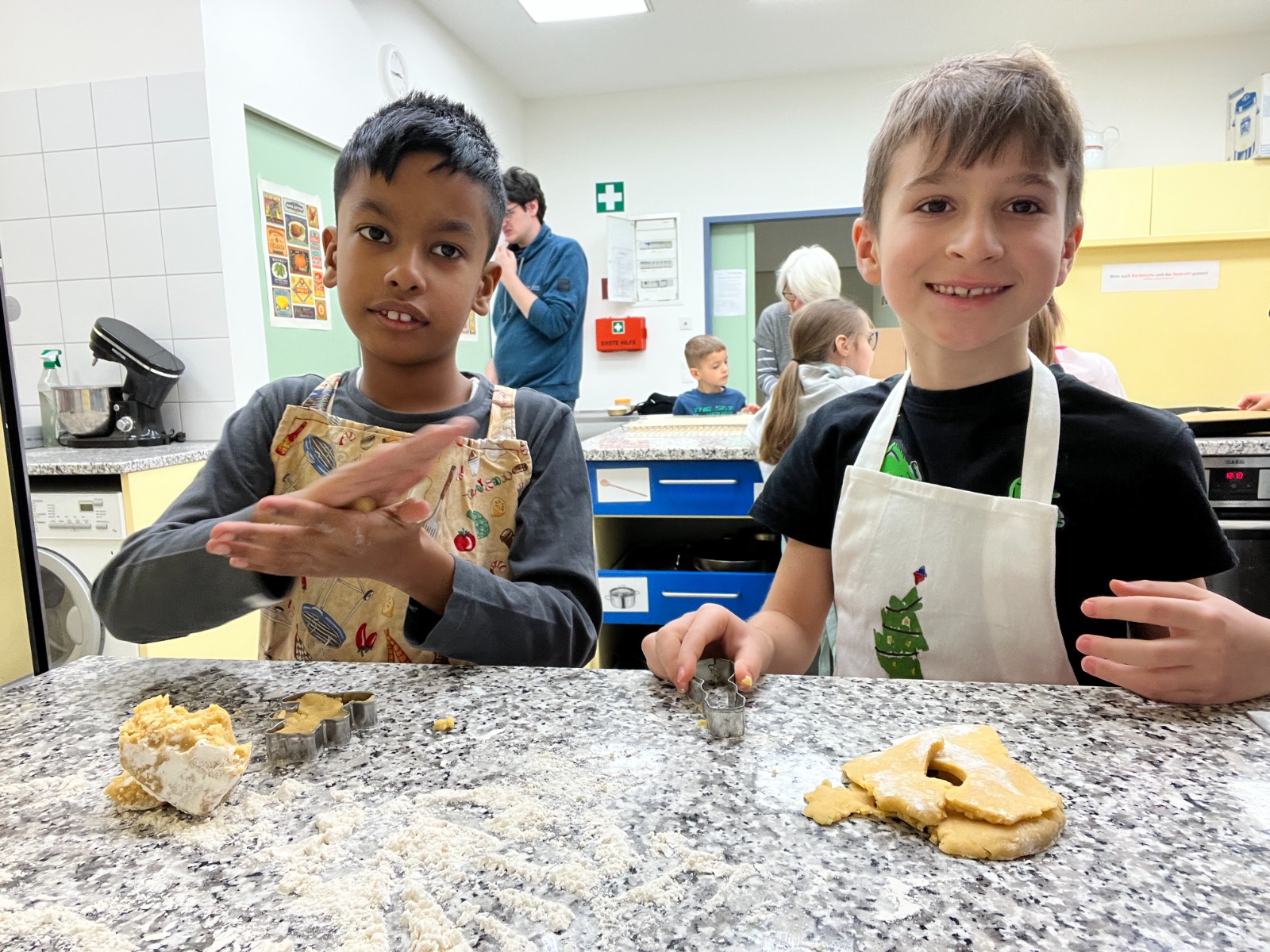 Die 2B hatte viel Spaß beim Keksebacken in der Schulküche. Zuerst wurde der Teig kräftig geknetet und anschließend mit dem Nudelholz ausgewalkt. Danach konnten die Kinder mit verschiedenen Förmchen köstliche Kekse ausstechen. Bald duftete es bis in die Aula nach frisch gebackenen Keksen.