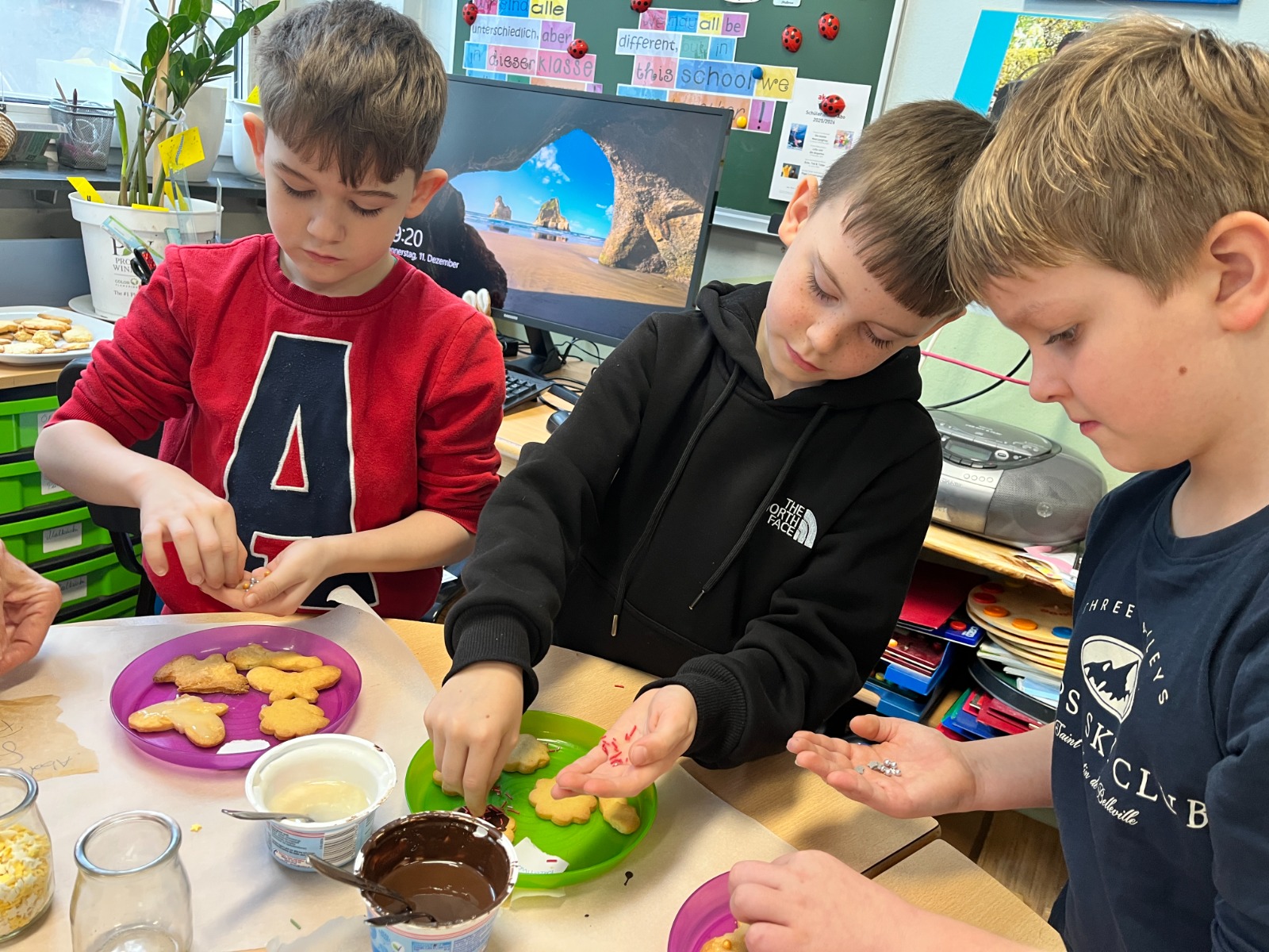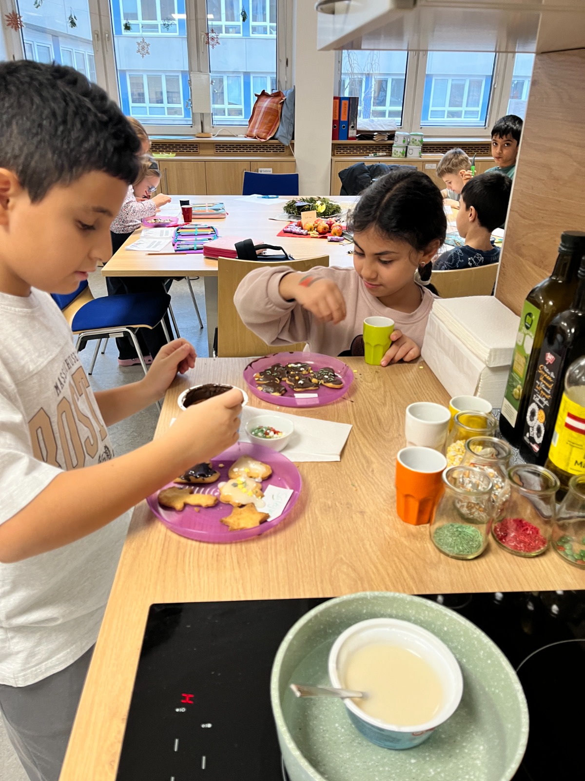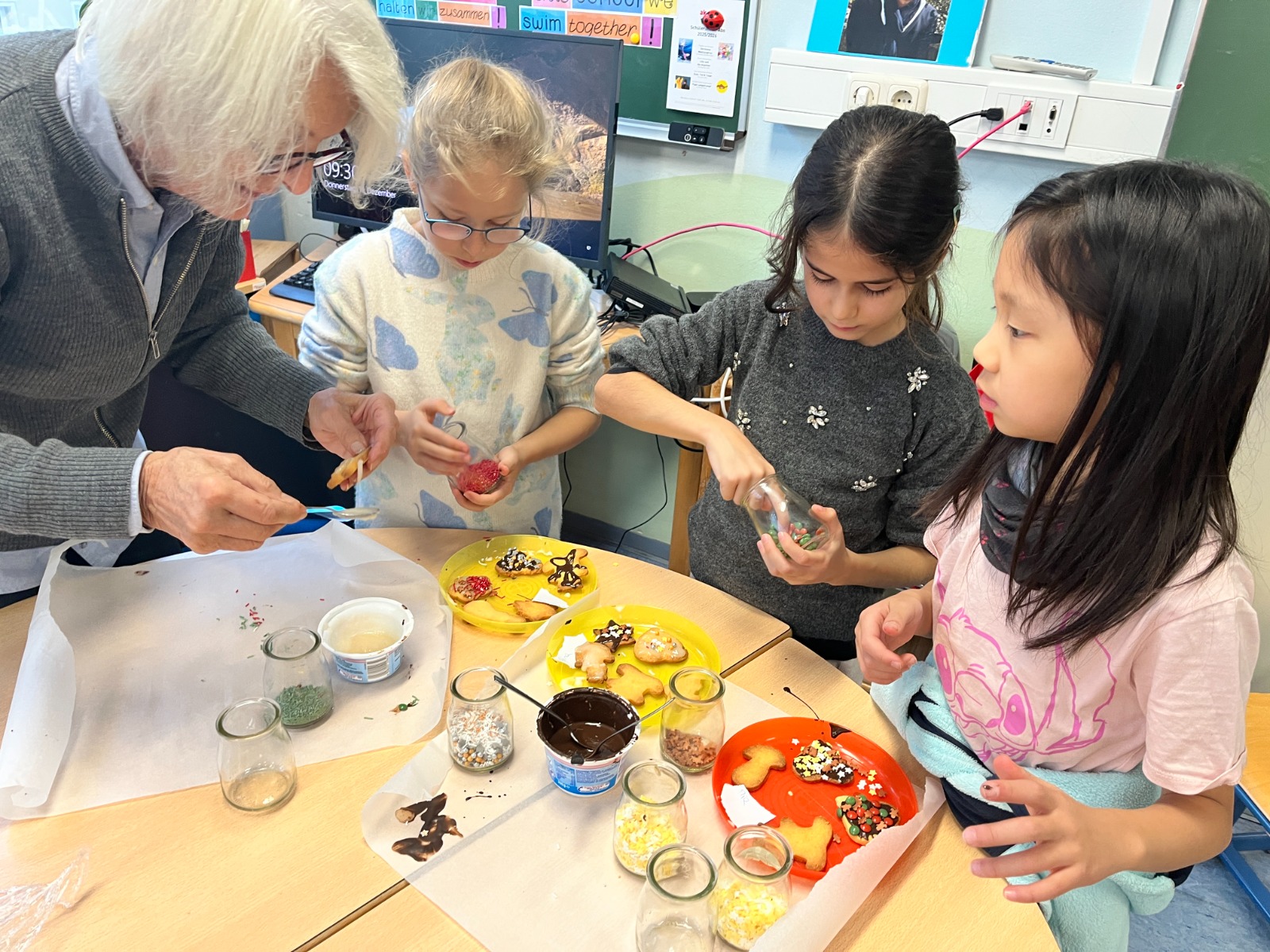 Besonders kreativ wurde es beim Verzieren: Mit Schokolade und bunten Streuseln gestalteten die Schülerinnen und Schüler ihre Kekse ganz nach eigenem Geschmack. Natürlich wurde auch gemeinsam probiert.