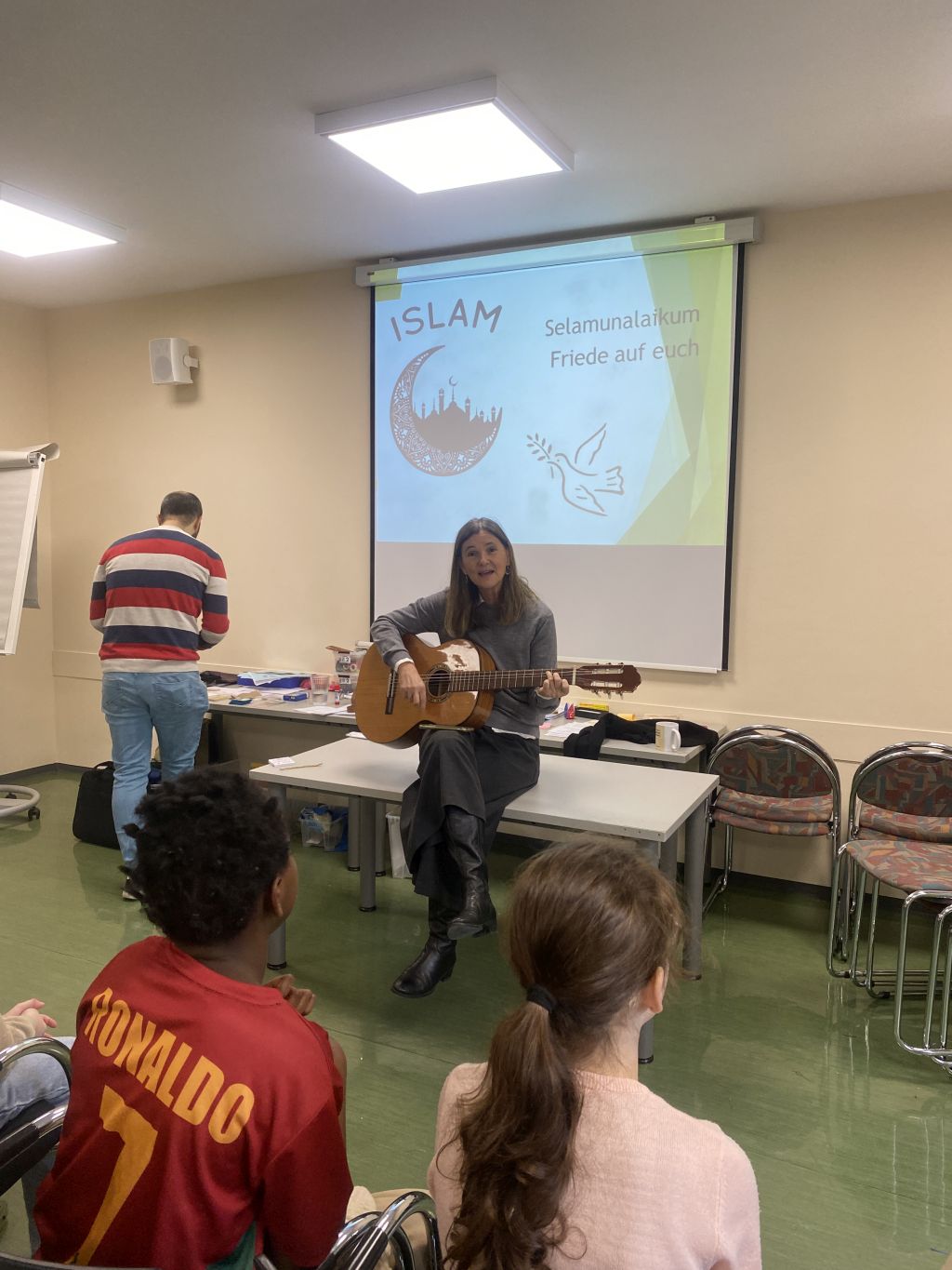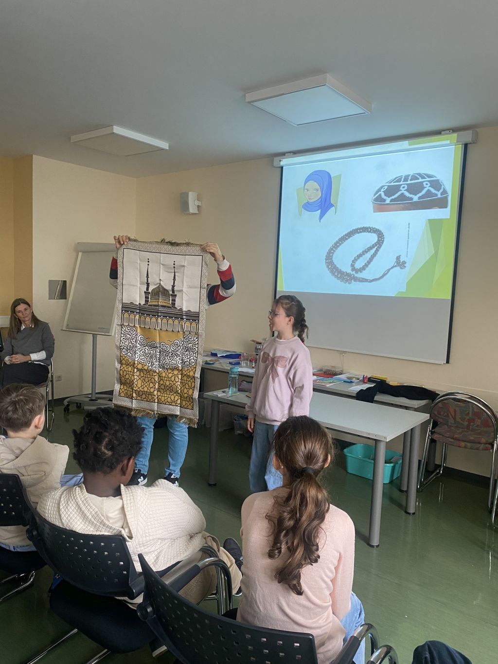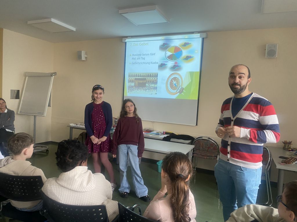 Am letzten Tag unseres Weltreligionenprojekts stand der Islam im Mittelpunkt. Unser islamischer Religionslehrer Mustafa führte uns durch die fünf Säulen des Islam und erhielt dabei großartige Unterstützung von mehreren muslimischen Schüler:innen. Gemeinsam beschäftigten wir uns mit den vielen Namen Allahs sowie mit dem Ablauf des muslimischen Gebets.