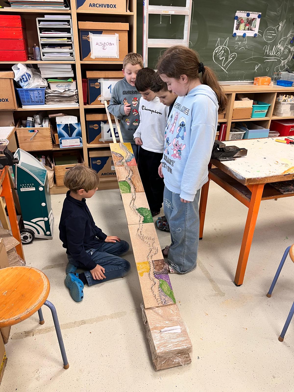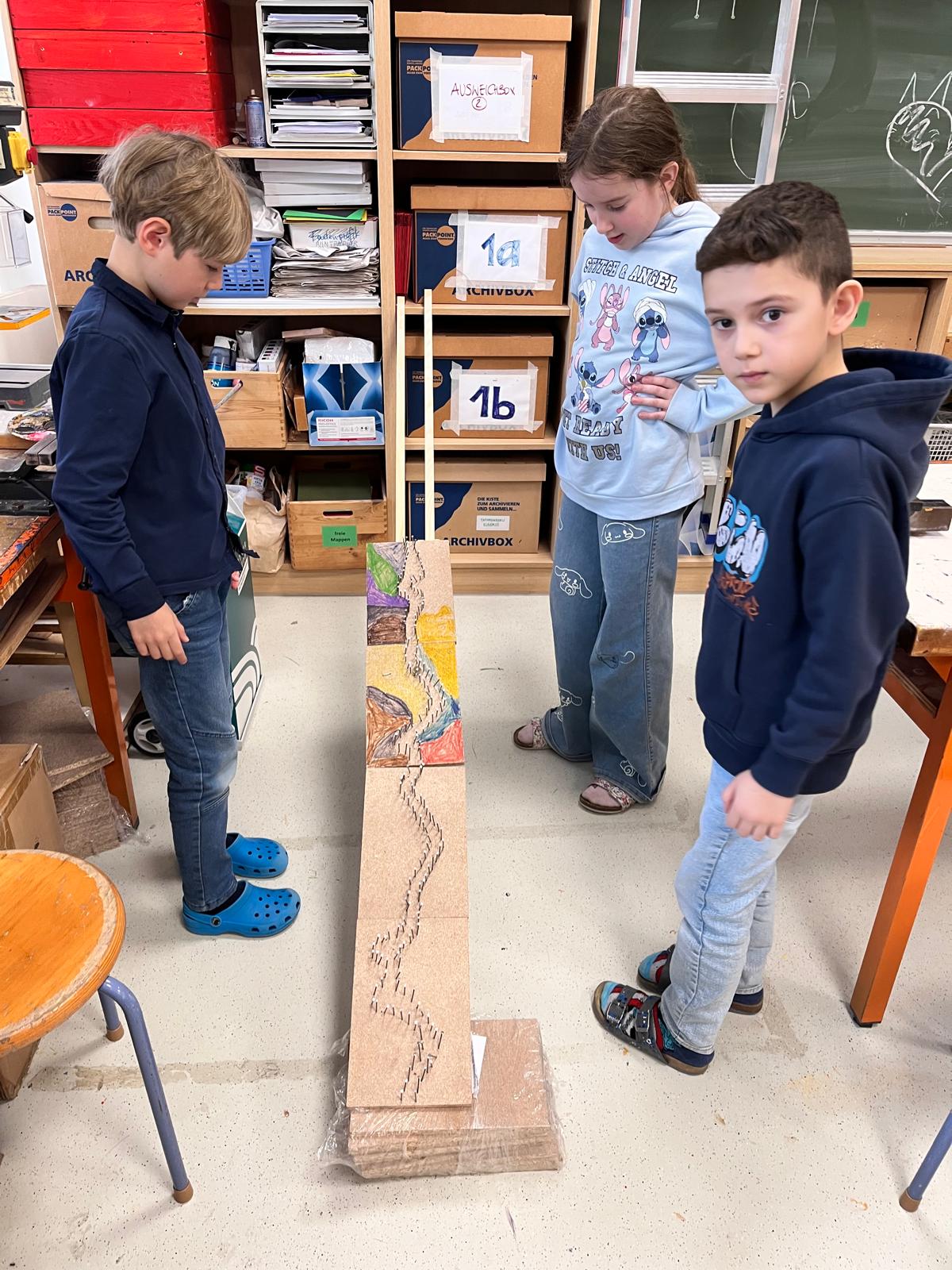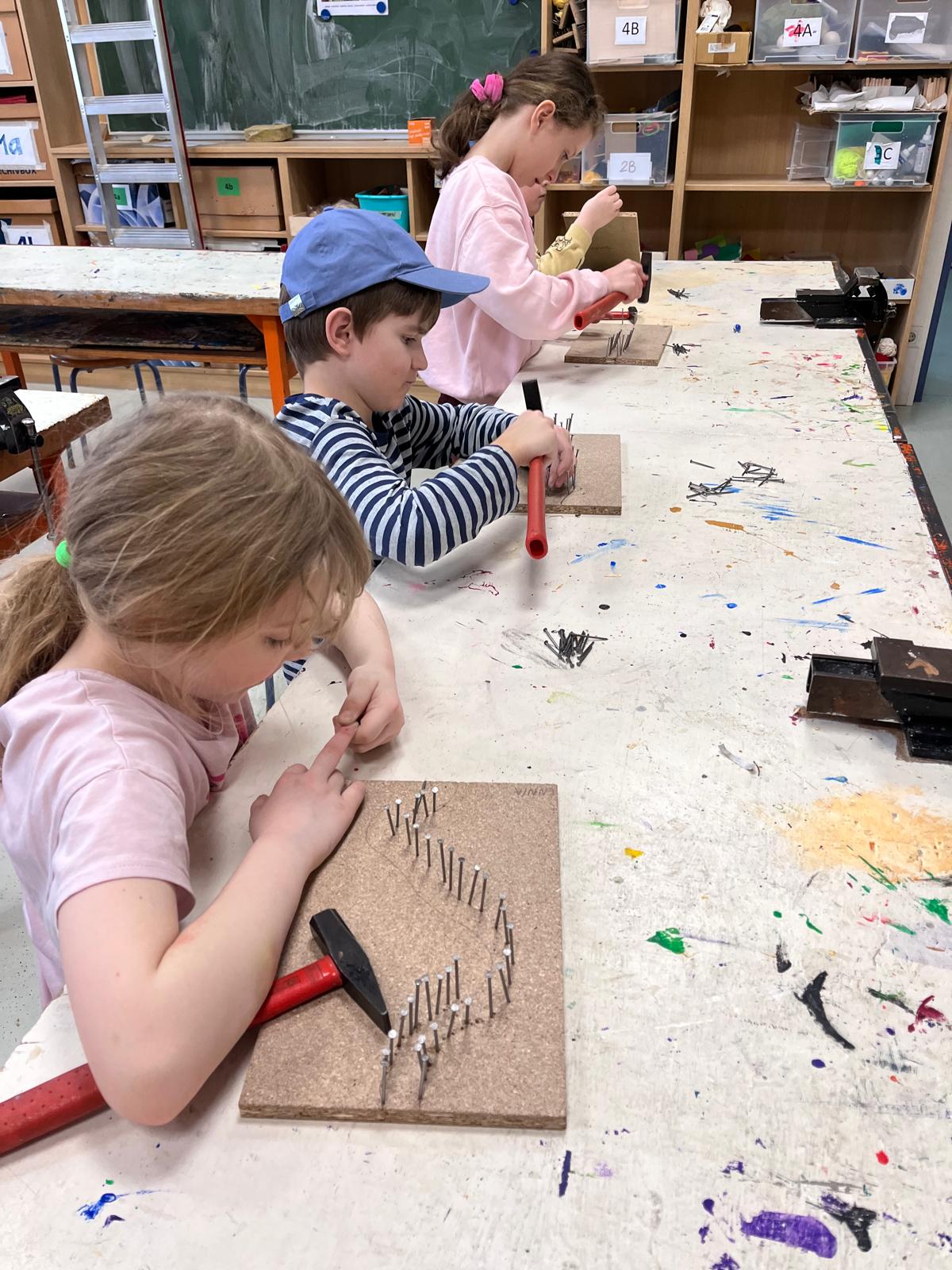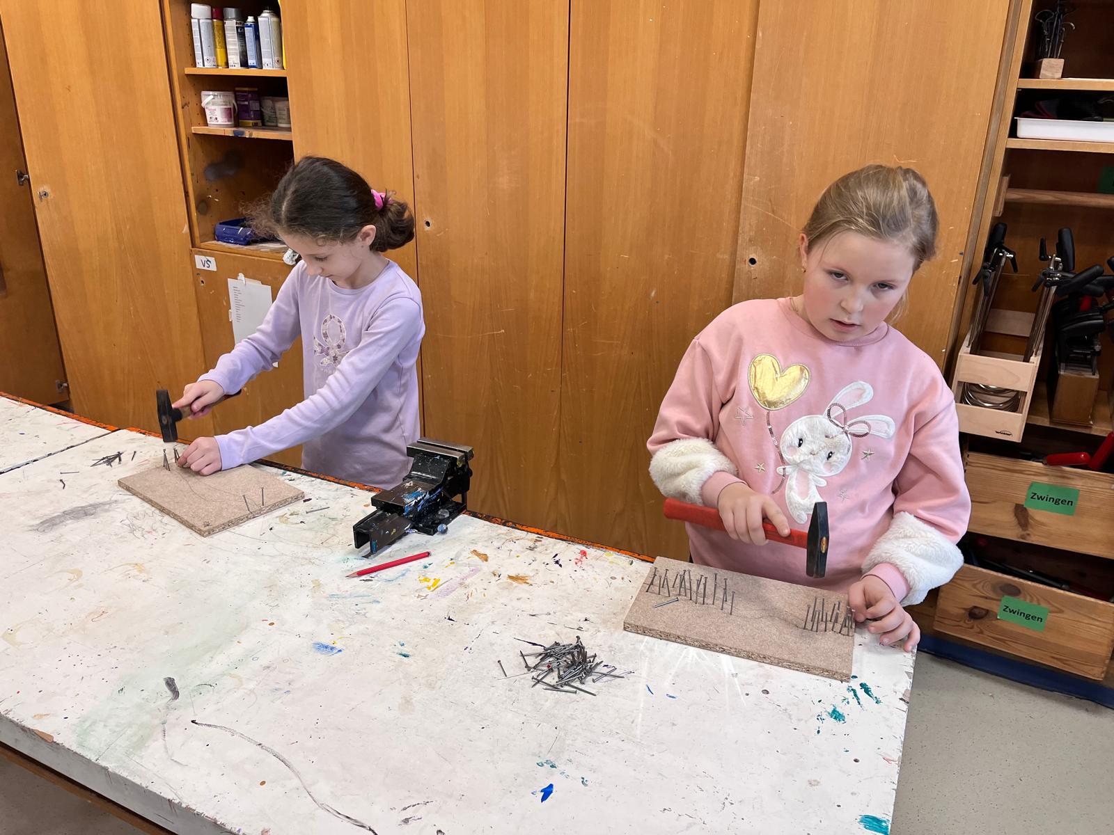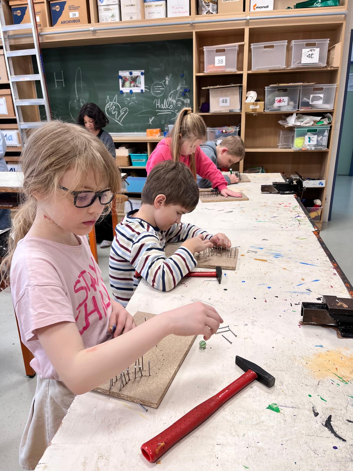 Die Kinder der 2A-Klasse bauten im Unterrichtsfach Technik und Design ihre eigenen Kugelbahnen. Mit Hammer und Nägeln gestaltete jedes Kind eine individuelle Bahn.
