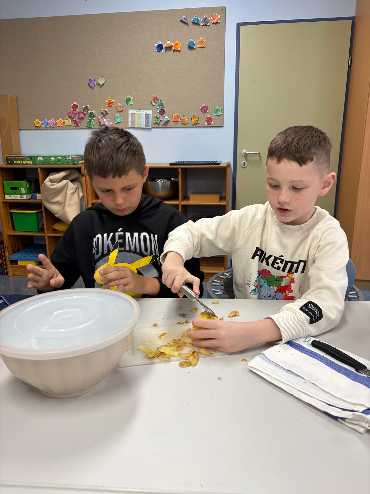 Die Schildkrötenklasse erlebte interessante und spannende Kartoffelwoche, in der sie die Kartoffelpflanze ganz genau erforschte und staunend entdeckte, wie viel in so einer Knolle steckt. Mit viel Freude gewannen die Kinder sogar eigene Stärke aus den Kartoffeln und fühlten sich dabei wie kleine Forscherinnen und Forscher. Zum Abschluss kochten alle gemeinsam eine köstliche Kartoffelsuppe, die natürlich mit großem Appetit verspeist wurde und die besondere Projektwoche wunderbar abrundete.