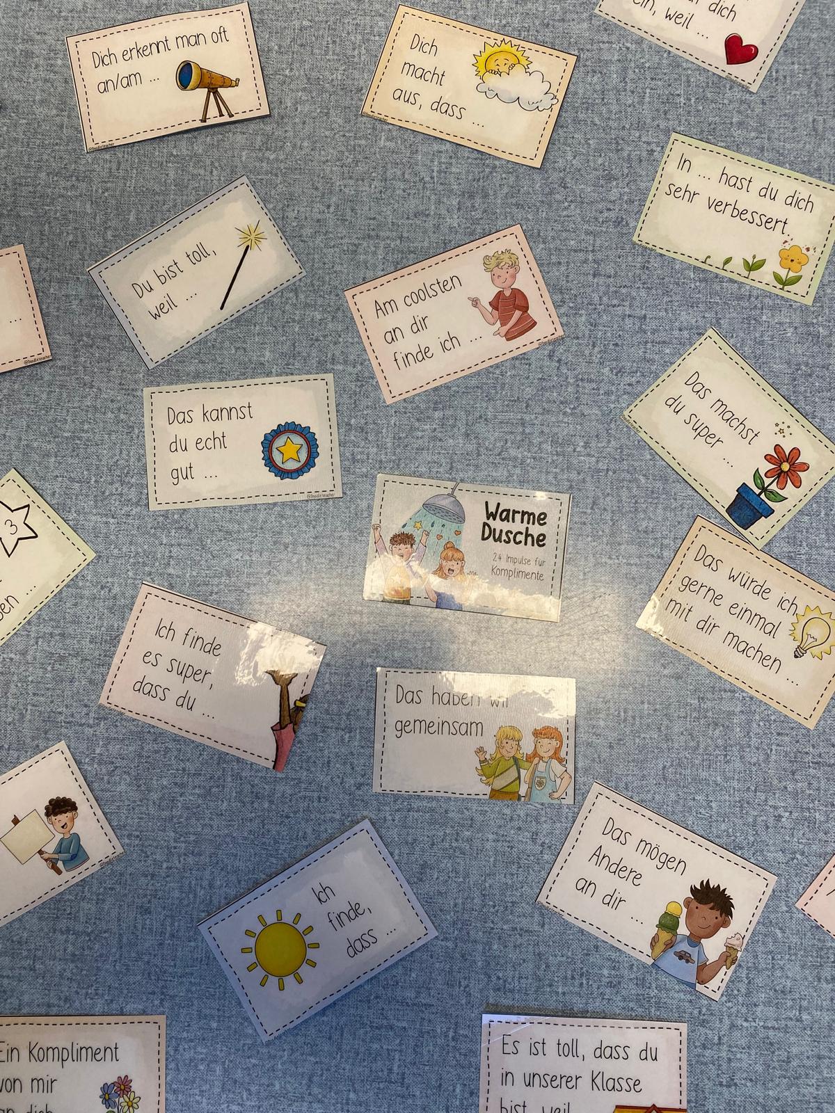 Ein Kind sitzt vorne auf dem „Duschplatz“, während die anderen überlegen, was sie an diesem Kind besonders schätzen. Die Komplimente werden gesagt oder auch aufgeschrieben – und oft kommen dabei ganz wunderbare Beobachtungen zusammen.