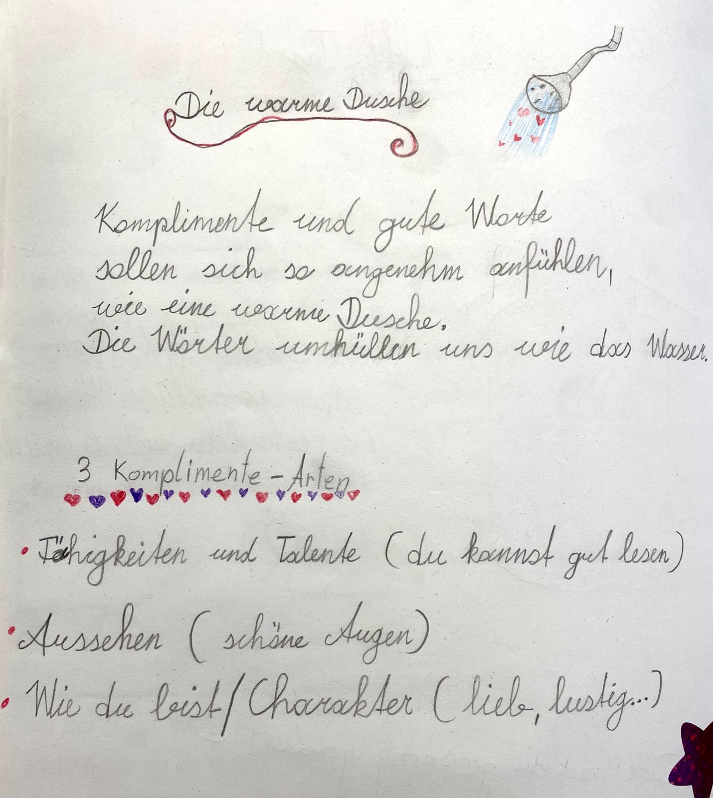 In der 3B wird regelmäßig geduscht – allerdings nicht mit Wasser, sondern mit netten Worten. Bei unserer „Warmen Dusche“ bekommt ein Kind von den Mitschülerinnen und Mitschülern Komplimente und freundliche Rückmeldungen.